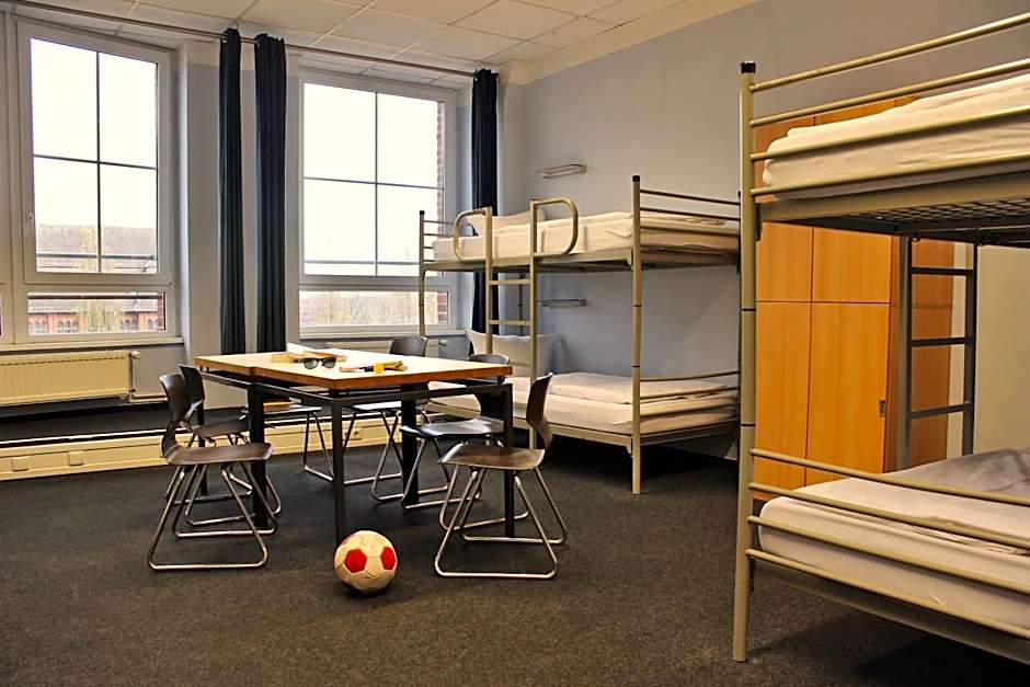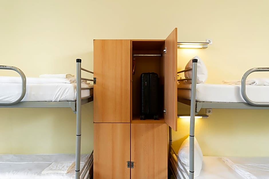 Large, simply furnished mixed dormitory. Shared bathroom facilities can be found in the hallway.